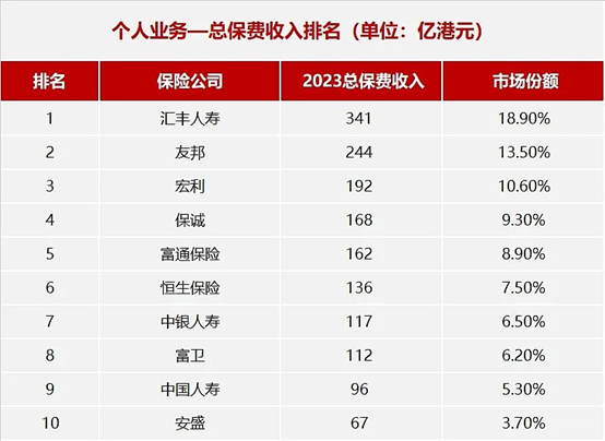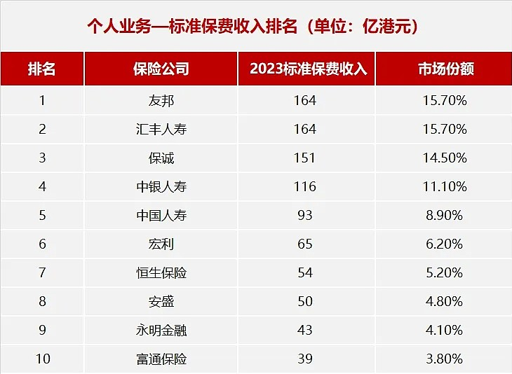按照标准保费收入,即整付*10%+年度化保费排名,前五大保险公司分别为友邦、汇丰人人寿、保诚、中银人寿以及中国人寿(海外)。