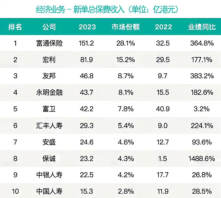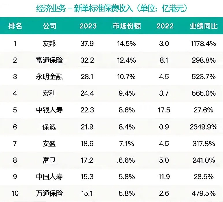按标准保费收入,排名前3的保险公司为友邦、富通和永明金融。
